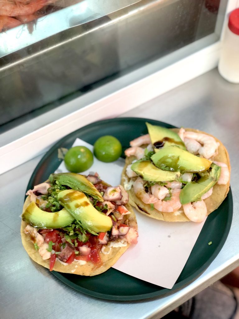 - Mariscos Orizaba: A tin stand on Liverpool street with incredibly goooood tostadas (and seafood dishes in general). Veracruz style dishes are served from 11am to sometime around 6pm. Their seafood tostadas are one of the best stops on our Juarez Highlights.